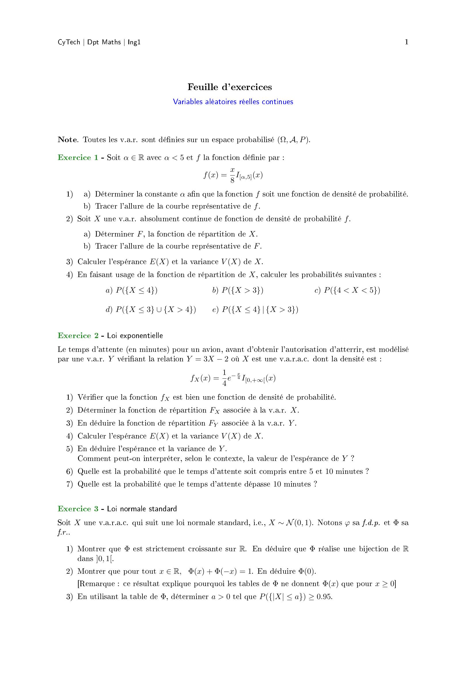 Page 1 : CyTech Dpt Maths Ing11Feuille d'exercicesVariables aléatoires réelles continuesNote. Toutes les v.a.r. sont dénies sur un espace probabilisé Ω, A, P.Exercice 1 - Soit α R avec α 5 et f la fonction dénie par :fx = x8 Iα,5x1a Déterminer la constante α an que la fonction f soit une fonction de densité de probabilité.b Tracer l'allure de la courbe représentative de f.2 Soit X une v.a.r. absolument continue de fonction de densité de probabilité f.a Déterminer F, la fonction de répartition de X.b Tracer l'allure de la courbe représentative de F.3 Calculer l'espérance EX et la variance V X de X.4 En faisant usage de la fonction de répartition de X, calculer les probabilités suivantes :a PX 4b PX 3c P4 X 5d PX 3 X 4e PX 4 X 3Exercice 2 - Loi exponentielleLe temps d'attente en minutes pour un avion, avant d'obtenir l'autorisation d'atterrir, est modélisépar une v.a.r. Y vériant la relation Y = 3X 2 où X est une v.a.r.a.c. dont la densité est :fXx = 14ex4 I0,+x1 Vérier que la fonction fX est bien une fonction de densité de probabilité.2 Déterminer la fonction de répartition FX associée à la v.a.r. X.3 En déduire la fonction de répartition FY associée à la v.a.r. Y .4 Calculer l'espérance EX et la variance V X de X.5 En déduire l'espérance et la variance de Y .Comment peut-on interpréter, selon le contexte, la valeur de l'espérance de Y ?6 Quelle est la probabilité que le temps d'attente soit compris entre 5 et 10 minutes ?7 Quelle est la probabilité que le temps d'attente dépasse 10 minutes ?Exercice 3 - Loi normale standardSoit X une v.a.r.a.c. qui suit une loi normale standard, i.e., X N0, 1. Notons ϕ sa f.d.p. et Φ saf.r..1 Montrer que Φ est strictement croissante sur R. En déduire que Φ réalise une bijection de Rdans 0, 1.2 Montrer que pour tout x R,Φx + Φx = 1. En déduire Φ0.Remarque : ce résultat explique pourquoi les tables de Φ ne donnent Φx que pour x 03 En utilisant la table de Φ, déterminer a 0 tel que PX a 0.95.