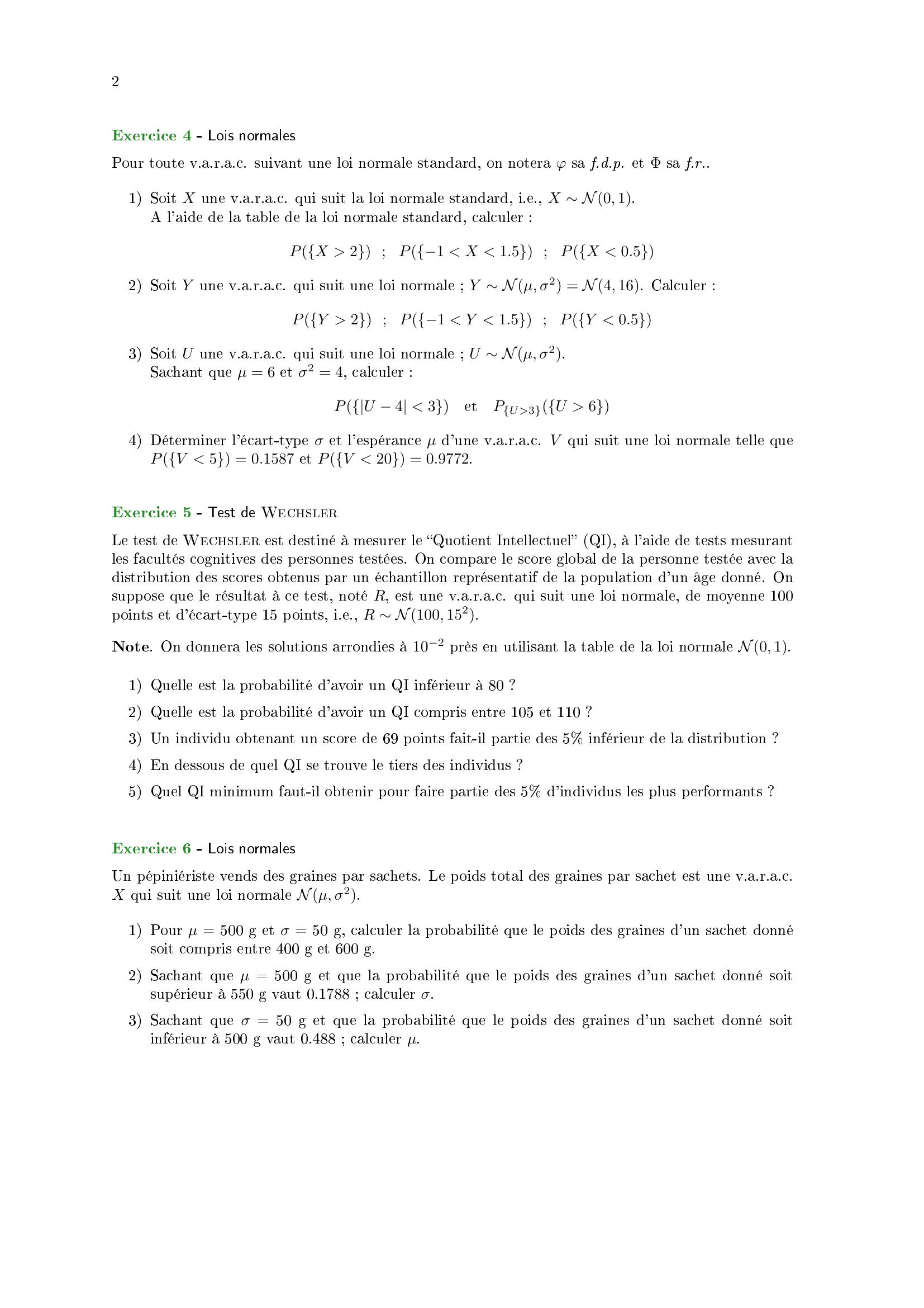 Page 2 : 2Exercice 4 - Lois normalesPour toute v.a.r.a.c. suivant une loi normale standard, on notera ϕ sa f.d.p. et Φ sa f.r..1 Soit X une v.a.r.a.c. qui suit la loi normale standard, i.e., X N0, 1.A l'aide de la table de la loi normale standard, calculer :PX 2 ;P1 X 1.5 ;PX 0.52 Soit Y une v.a.r.a.c. qui suit une loi normale ; Y Nµ, σ2 = N4, 16. Calculer :PY 2 ;P1 Y 1.5 ;PY 0.53 Soit U une v.a.r.a.c. qui suit une loi normale ; U Nµ, σ2.Sachant que µ = 6 et σ2 = 4, calculer :PU 4 3etPU3U 64 Déterminer l'écart-type σ et l'espérance µ d'une v.a.r.a.c. V qui suit une loi normale telle quePV 5 = 0.1587 et PV 20 = 0.9772.Exercice 5 - Test de WechslerLe test de Wechsler est destiné à mesurer le Quotient Intellectuel QI, à l'aide de tests mesurantles facultés cognitives des personnes testées. On compare le score global de la personne testée avec ladistribution des scores obtenus par un échantillon représentatif de la population d'un âge donné. Onsuppose que le résultat à ce test, noté R, est une v.a.r.a.c. qui suit une loi normale, de moyenne 100points et d'écart-type 15 points, i.e., R N100, 152.Note. On donnera les solutions arrondies à 102 près en utilisant la table de la loi normale N0, 1.1 Quelle est la probabilité d'avoir un QI inférieur à 80 ?2 Quelle est la probabilité d'avoir un QI compris entre 105 et 110 ?3 Un individu obtenant un score de 69 points fait-il partie des 5 inférieur de la distribution ?4 En dessous de quel QI se trouve le tiers des individus ?5 Quel QI minimum faut-il obtenir pour faire partie des 5 d'individus les plus performants ?Exercice 6 - Lois normalesUn pépiniériste vends des graines par sachets. Le poids total des graines par sachet est une v.a.r.a.c.X qui suit une loi normale Nµ, σ2.1 Pour µ = 500 g et σ = 50 g, calculer la probabilité que le poids des graines d'un sachet donnésoit compris entre 400 g et 600 g.2 Sachant que µ = 500 g et que la probabilité que le poids des graines d'un sachet donné soitsupérieur à 550 g vaut 0.1788 ; calculer σ.3 Sachant que σ = 50 g et que la probabilité que le poids des graines d'un sachet donné soitinférieur à 500 g vaut 0.488 ; calculer µ.