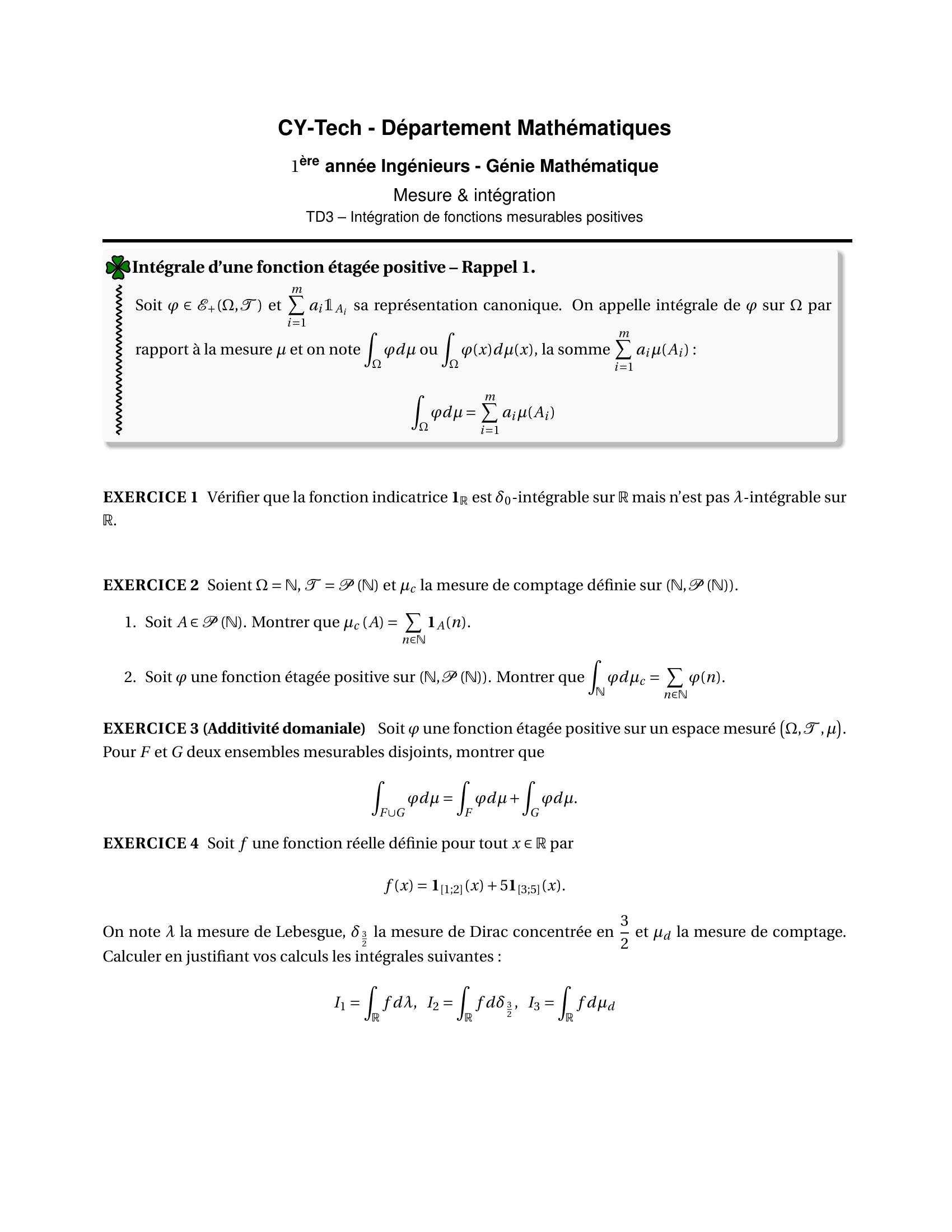 Page 1 : CY-Tech - Département Mathématiques1ère année Ingénieurs - Génie MathématiqueMesure & intégrationTD3 – Intégration de fonctions mesurables positivesSoit ϕ E+Ω,T etmXi=1ai1Ai sa représentation canonique. On appelle intégrale de ϕ sur Ωparrapport à la mesure µ et on noteZΩϕdµ ouZΩϕxdµx, la sommemXi=1aiµAi :ZΩϕdµ =mXi=1aiµAiIntégrale d’une fonction étagée positive – Rappel 1.EXERCICE 1 Vérifier que la fonction indicatrice 1R est δ0-intégrable sur R mais n’est pas λ-intégrable surR.EXERCICE 2 Soient Ω= N, T = P N et µc la mesure de comptage définie sur N,P N.1. Soit A P N. Montrer que µc A =XnN1An.2. Soit ϕ une fonction étagée positive sur N,P N. Montrer queZNϕdµc =XnNϕn.EXERCICE 3 Additivité domaniale Soit ϕ une fonction étagée positive sur un espace mesuré¡Ω,T ,µ¢.Pour F et G deux ensembles mesurables disjoints, montrer queZFGϕdµ =ZFϕdµ+ZGϕdµ.EXERCICE 4 Soit f une fonction réelle définie pour tout x R parf x = 11;2x+513;5x.On note λ la mesure de Lebesgue, δ 32 la mesure de Dirac concentrée en 32 et µd la mesure de comptage.Calculer en justifiant vos calculs les intégrales suivantes :I1 =ZRf dλ, I2 =ZRf dδ 32 , I3 =ZRf dµd