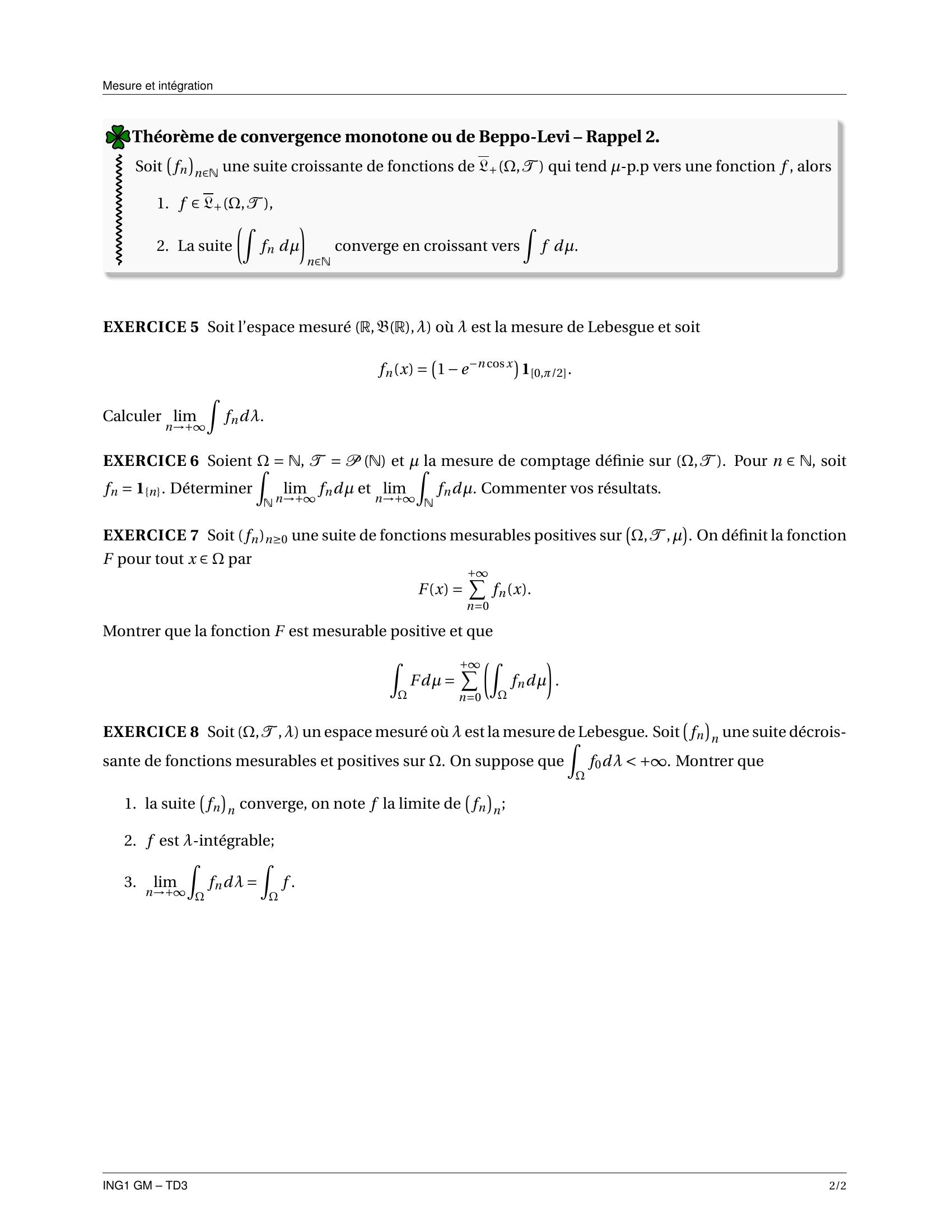 Page 2 : Mesure et intégrationSoit¡fn¢nN une suite croissante de fonctions de L+Ω,T qui tend µ-p.p vers une fonction f , alors1. f L+Ω,T ,2. La suiteµZfn dµ¶nNconverge en croissant versZf dµ.Théorème de convergence monotone ou de Beppo-Levi – Rappel 2.EXERCICE 5 Soit l’espace mesuré R,BR,λ où λ est la mesure de Lebesgue et soitfnx =¡1en cosx¢10,π/2.Calculer limn→+Zfndλ.EXERCICE 6 Soient Ω= N, T = P N et µ la mesure de comptage définie sur Ω,T . Pour n N, soitfn = 1n. DéterminerZNlimn→+fndµ et limn→+ZNfndµ. Commenter vos résultats.EXERCICE 7 Soit fnn0 une suite de fonctions mesurables positives sur¡Ω,T ,µ¢. On définit la fonctionF pour tout x ΩparFx =+Xn=0fnx.Montrer que la fonction F est mesurable positive et queZΩFdµ =+Xn=0µZΩfndµ¶.EXERCICE 8 Soit Ω,T ,λ un espace mesuré où λ est la mesure de Lebesgue. Soit¡fn¢n une suite décrois-sante de fonctions mesurables et positives sur Ω. On suppose queZΩf0dλ +. Montrer que1. la suite¡fn¢n converge, on note f la limite de¡fn¢n;2. f est λ-intégrable;3.limn→+ZΩfndλ =ZΩf .ING1 GM – TD32/2
