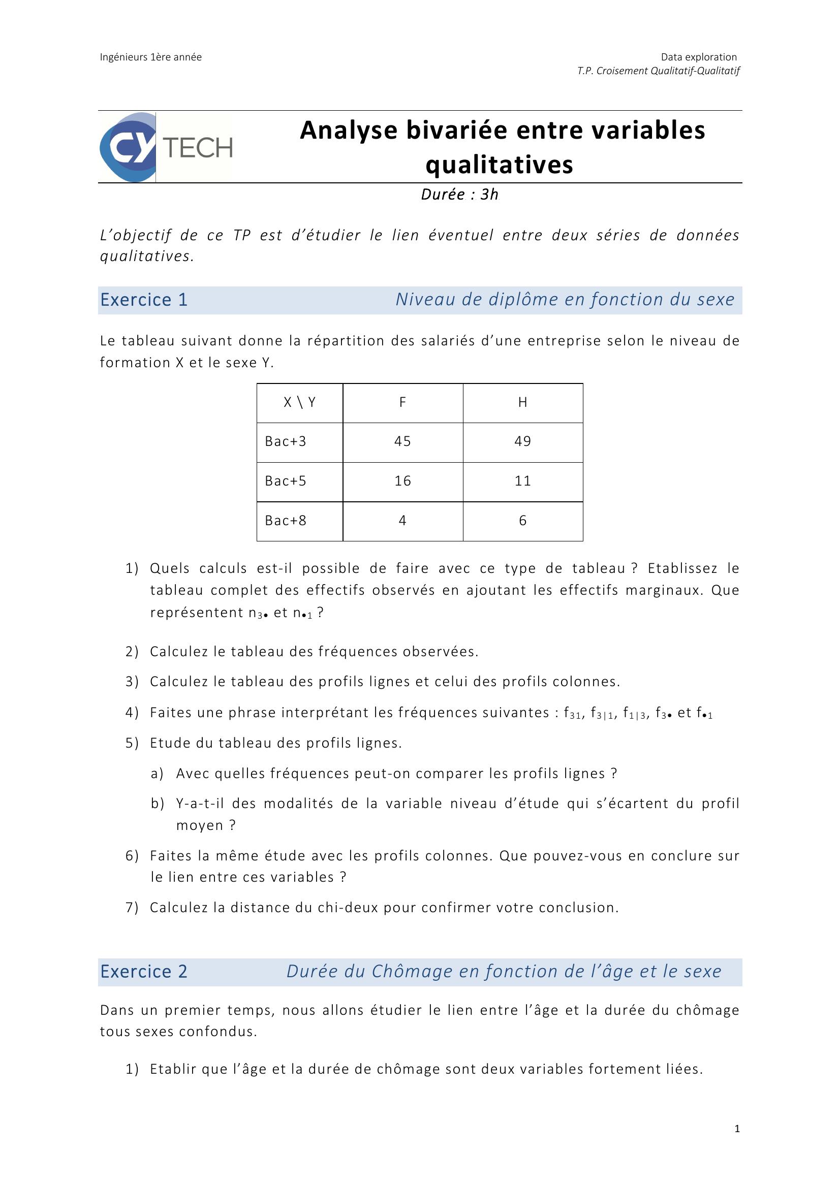 Page 1 : Ingénieurs 1ère année Data exploration T.P. Croisement Qualitatif-Qualitatif 1 Analyse bivariée entre variables qualitatives Durée : 3h L’objectif de ce TP est d’étudier le lien éventuel entre deux séries de données qualitatives. Exercice 1 Niveau de diplôme en fonction du sexe Le tableau suivant donne la répartition des salariés d’une entreprise selon le niveau de formation X et le sexe Y. X \ Y F H Bac+3 45 49 Bac+5 16 11 Bac+8 4 6 1 Quels calculs est-il possible de faire avec ce type de tableau ? Etablissez le tableau complet des effectifs observés en ajoutant les effectifs marginaux. Que représentent n3• et n•1 ? 2 Calculez le tableau des fréquences observées. 3 Calculez le tableau des profils lignes et celui des profils colonnes. 4 Faites une phrase interprétant les fréquences suivantes : f31, f31, f13, f3• et f•1 5 Etude du tableau des profils lignes. a Avec quelles fréquences peut-on comparer les profils lignes ? b Y-a-t-il des modalités de la variable niveau d’étude qui s’écartent du profil moyen ? 6 Faites la même étude avec les profils colonnes. Que pouvez-vous en conclure sur le lien entre ces variables ? 7 Calculez la distance du chi-deux pour confirmer votre conclusion. Exercice 2 Durée du Chômage en fonction de l’âge et le sexe Dans un premier temps, nous allons étudier le lien entre l’âge et la durée du chômage tous sexes confondus. 1 Etablir que l’âge et la durée de chômage sont deux variables fortement liées.