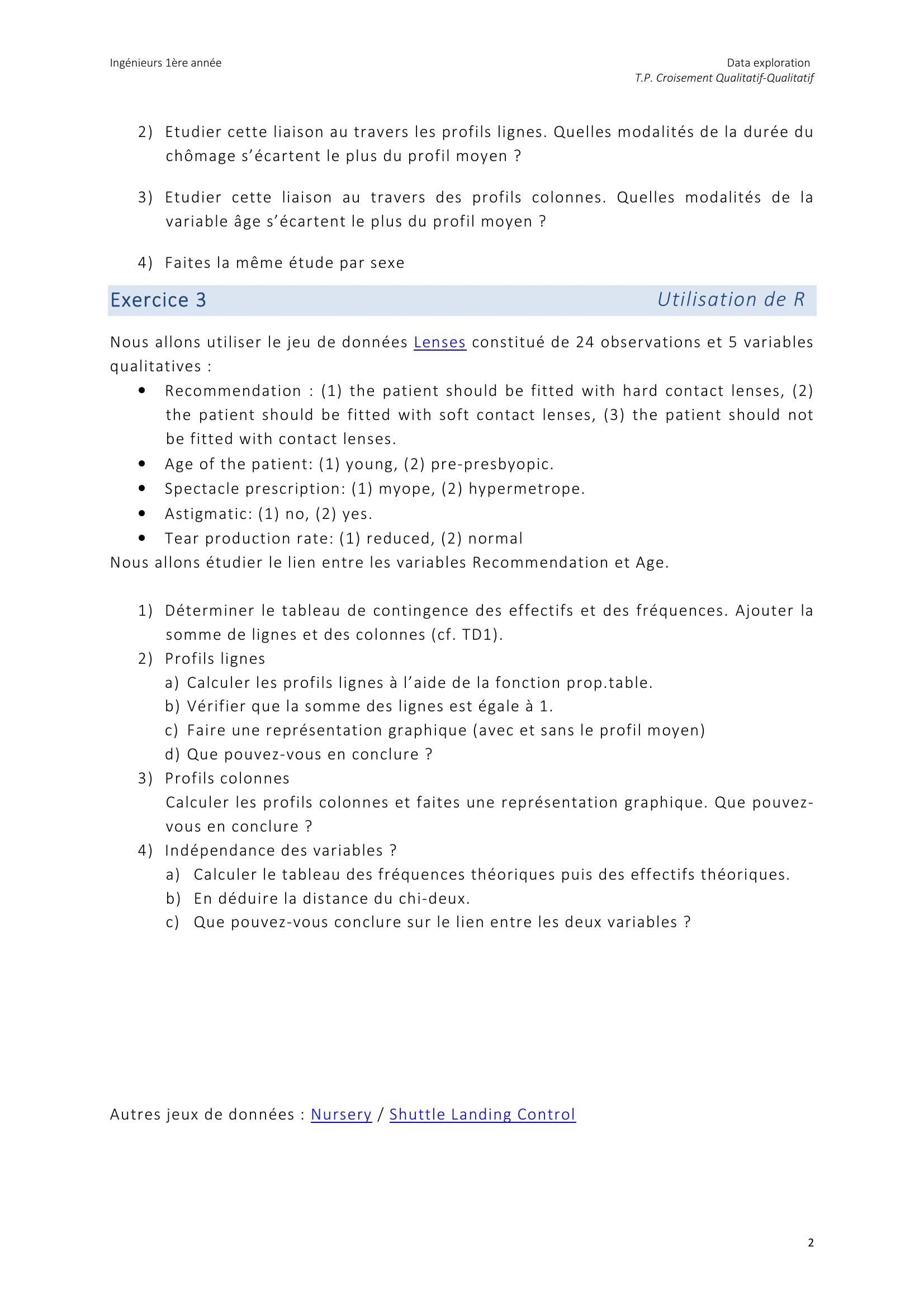 Page 2 : Ingénieurs 1ère année Data exploration T.P. Croisement Qualitatif-Qualitatif 2 2 Etudier cette liaison au travers les profils lignes. Quelles modalités de la durée du chômage s’écartent le plus du profil moyen ? 3 Etudier cette liaison au travers des profils colonnes. Quelles modalités de la variable âge s’écartent le plus du profil moyen ? 4 Faites la même étude par sexe Exercice 3 Utilisation de R Nous allons utiliser le jeu de données Lenses constitué de 24 observations et 5 variables qualitatives : • Recommendation : 1 the patient should be fitted with hard contact lenses, 2 the patient should be fitted with soft contact lenses, 3 the patient should not be fitted with contact lenses. • Age of the patient: 1 young, 2 pre-presbyopic. • Spectacle prescription: 1 myope, 2 hypermetrope. • Astigmatic: 1 no, 2 yes. • Tear production rate: 1 reduced, 2 normal Nous allons étudier le lien entre les variables Recommendation et Age. 1 Déterminer le tableau de contingence des effectifs et des fréquences. Ajouter la somme de lignes et des colonnes cf. TD1. 2 Profils lignes a Calculer les profils lignes à l’aide de la fonction prop.table. b Vérifier que la somme des lignes est égale à 1. c Faire une représentation graphique avec et sans le profil moyen d Que pouvez-vous en conclure ? 3 Profils colonnes Calculer les profils colonnes et faites une représentation graphique. Que pouvez-vous en conclure ? 4 Indépendance des variables ? a Calculer le tableau des fréquences théoriques puis des effectifs théoriques. b En déduire la distance du chi-deux. c Que pouvez-vous conclure sur le lien entre les deux variables ? Autres jeux de données : Nursery / Shuttle Landing Control
