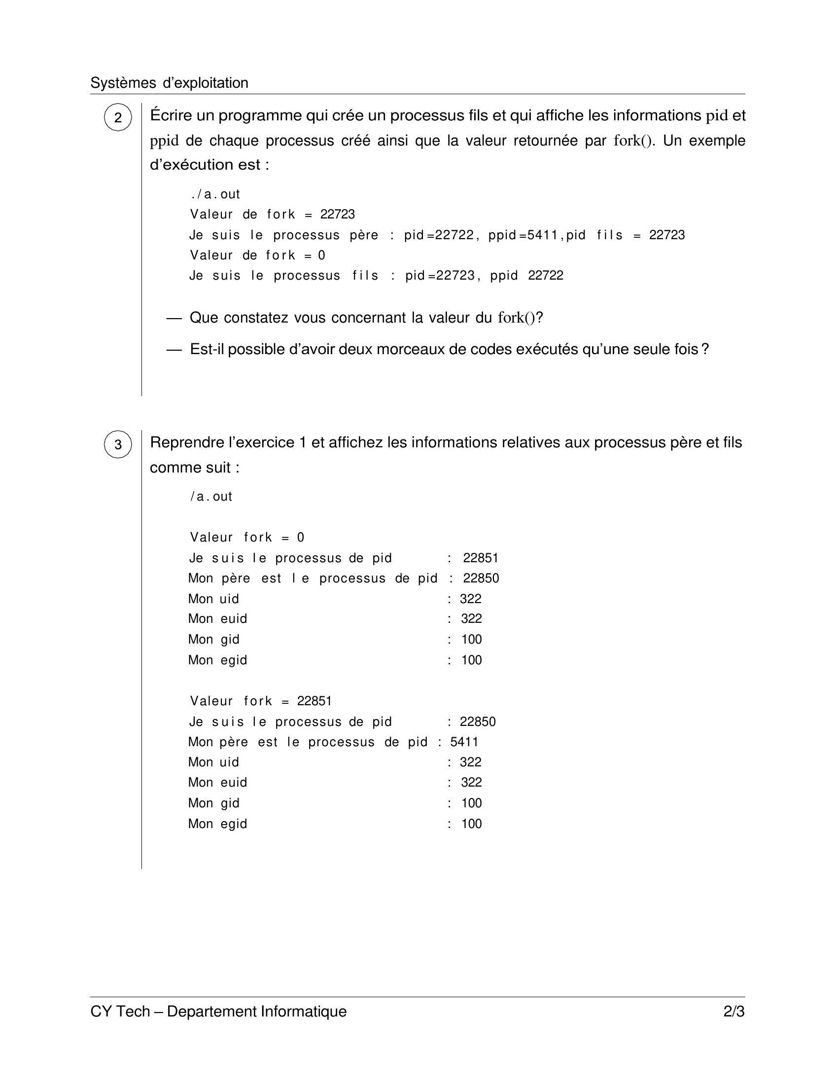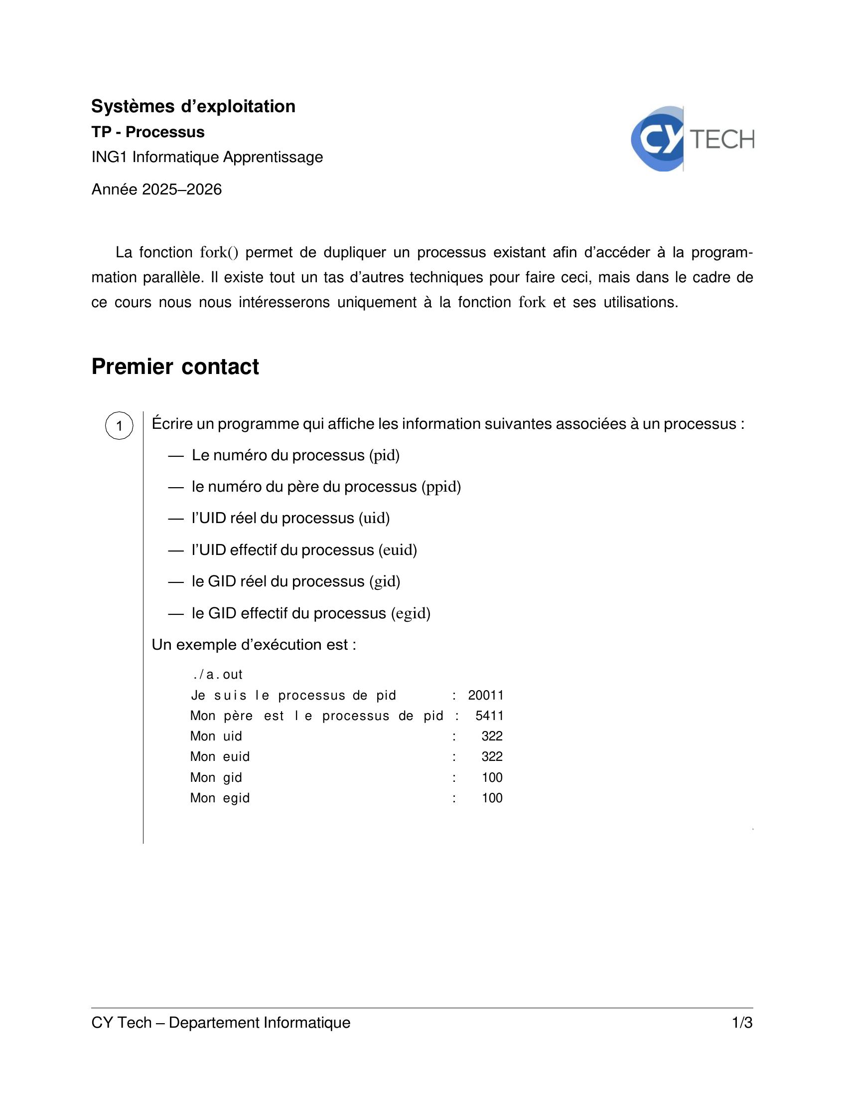 Page 1 : Systèmes d’exploitation CY Tech – Departement Informatique 1/3 TP - Processus ING1 Informatique Apprentissage Année 2025–2026 La fonction fork permet de dupliquer un processus existant afin d’accéder à la program- mation parallèle. Il existe tout un tas d’autres techniques pour faire ceci, mais dans le cadre de ce cours nous nous intéresserons uniquement à la fonction fork et ses utilisations. Premier contact Écrire un programme qui affiche les information suivantes associées à un processus : — Le numéro du processus pid — le numéro du père du processus ppid — l’UID réel du processus uid — l’UID effectif du processus euid — le GID réel du processus gid — le GID effectif du processus egid Un exemple d’exécution est : . / a . out Je s u i s l e processus de pid : 20011 Mon père est l e processus de pid : 5411 Mon uid : 322 Mon euid : 322 Mon gid : 100 Mon egid : 100 □