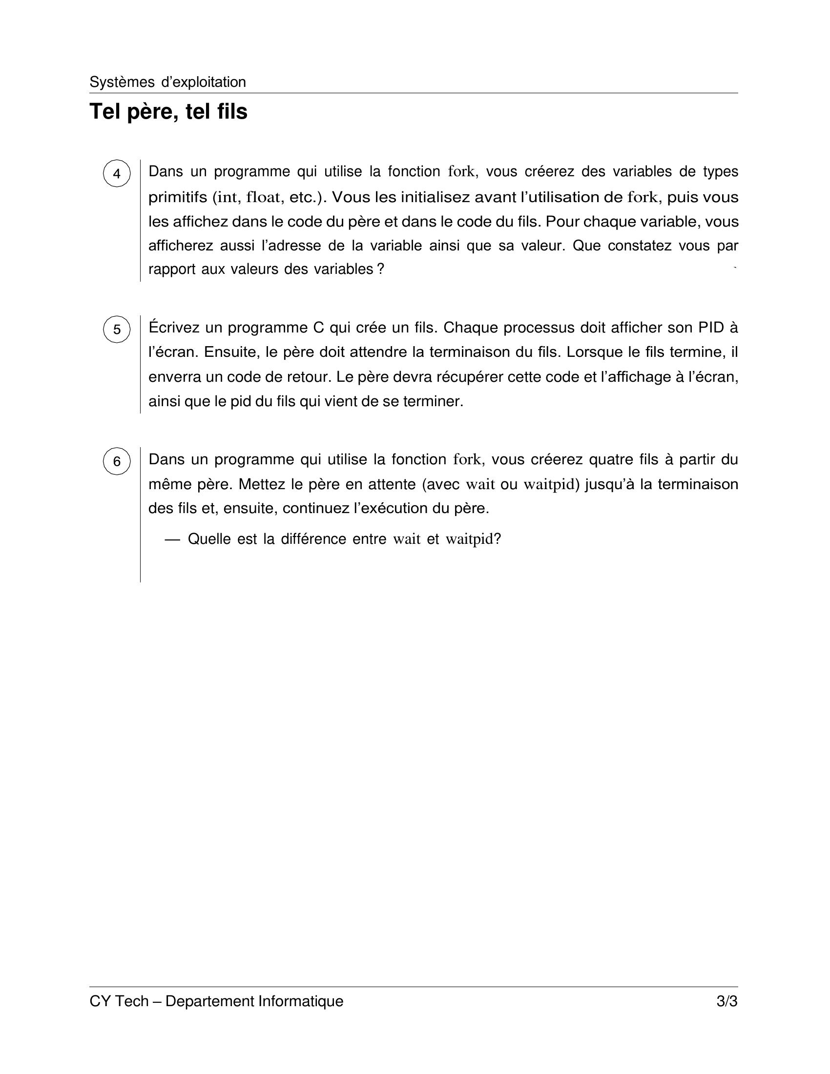 Page 3 : Systèmes d’exploitation CY Tech – Departement Informatique 3/3 Tel père, tel fils Dans un programme qui utilise la fonction fork, vous créerez des variables de types primitifs int, float, etc.. Vous les initialisez avant l’utilisation de fork, puis vous les affichez dans le code du père et dans le code du fils. Pour chaque variable, vous afficherez aussi l’adresse de la variable ainsi que sa valeur. Que constatez vous par rapport aux valeurs des variables ? □ Écrivez un programme C qui crée un fils. Chaque processus doit afficher son PID à l’écran. Ensuite, le père doit attendre la terminaison du fils. Lorsque le fils termine, il enverra un code de retour. Le père devra récupérer cette code et l’affichage à l’écran, ainsi que le pid du fils qui vient de se terminer. □ Dans un programme qui utilise la fonction fork, vous créerez quatre fils à partir du même père. Mettez le père en attente avec wait ou waitpid jusqu’à la terminaison des fils et, ensuite, continuez l’exécution du père. — Quelle est la différence entre wait et waitpid? □