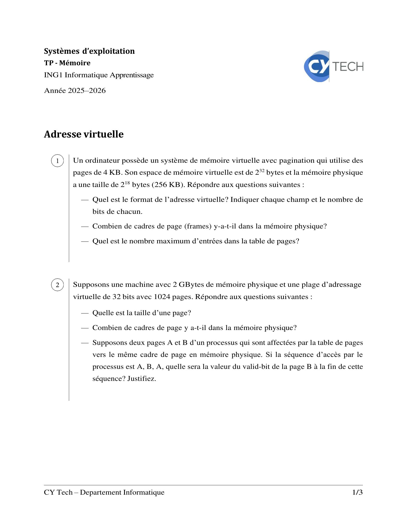 Page 1 : Systèmes d’exploitation CY Tech – Departement Informatique 1/3 TP - Mémoire ING1 Informatique Apprentissage Année 2025–2026 Adresse virtuelle Un ordinateur possède un système de mémoire virtuelle avec pagination qui utilise des pages de 4 KB. Son espace de mémoire virtuelle est de 232 bytes et la mémoire physique a une taille de 218 bytes 256 KB. Répondre aux questions suivantes : — Quel est le format de l’adresse virtuelle? Indiquer chaque champ et le nombre de bits de chacun. — Combien de cadres de page frames y-a-t-il dans la mémoire physique? — Quel est le nombre maximum d’entrées dans la table de pages? Supposons une machine avec 2 GBytes de mémoire physique et une plage d’adressage virtuelle de 32 bits avec 1024 pages. Répondre aux questions suivantes : — Quelle est la taille d’une page? — Combien de cadres de page y a-t-il dans la mémoire physique? — Supposons deux pages A et B d’un processus qui sont affectées par la table de pages vers le même cadre de page en mémoire physique. Si la séquence d’accès par le processus est A, B, A, quelle sera la valeur du valid-bit de la page B à la fin de cette séquence? Justifiez.