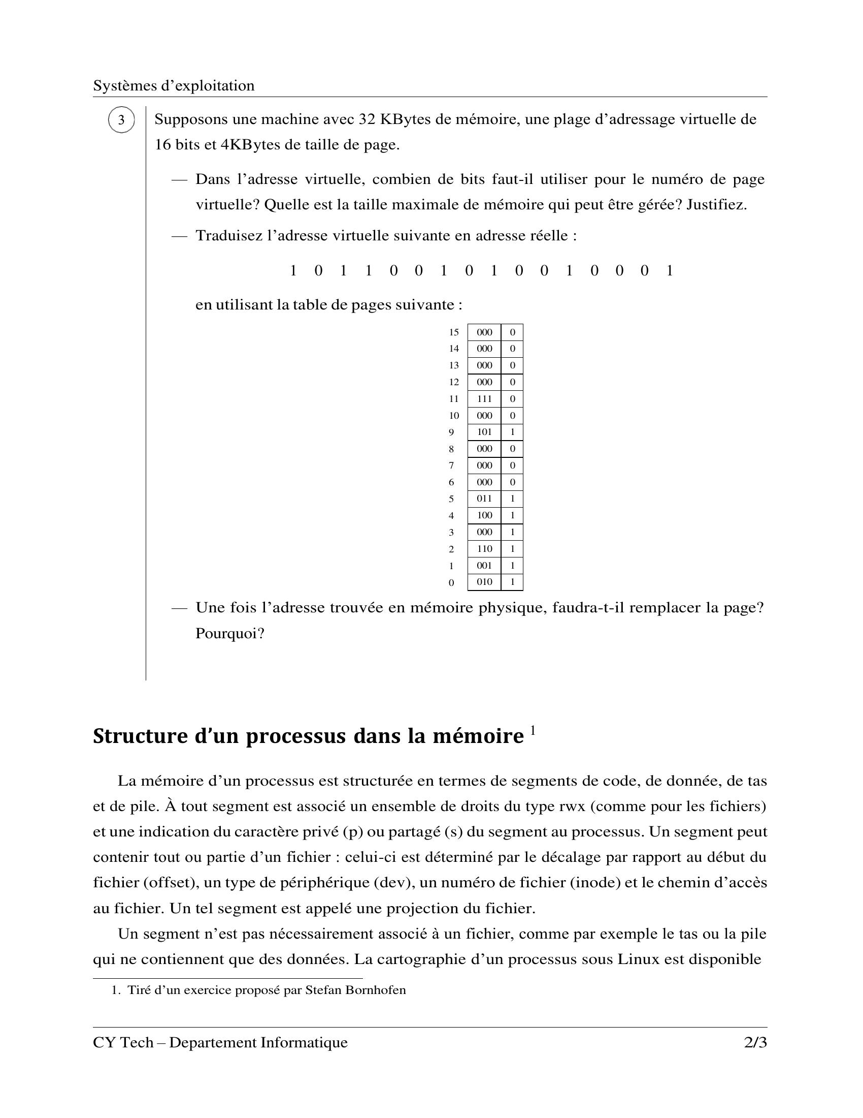 Page 2 : Systèmes d’exploitation CY Tech – Departement Informatique 2/3 Supposons une machine avec 32 KBytes de mémoire, une plage d’adressage virtuelle de 16 bits et 4KBytes de taille de page. — Dans l’adresse virtuelle, combien de bits faut-il utiliser pour le numéro de page virtuelle? Quelle est la taille maximale de mémoire qui peut être gérée? Justifiez. — Traduisez l’adresse virtuelle suivante en adresse réelle : 1 0 1 1 0 0 1 0 1 0 0 1 0 0 0 1 en utilisant la table de pages suivante : 15 14 13 12 11 10 9 8 7 6 5 4 3 2 1 0 — Une fois l’adresse trouvée en mémoire physique, faudra-t-il remplacer la page? Pourquoi? Structure d’un processus dans la mémoire 1 La mémoire d’un processus est structurée en termes de segments de code, de donnée, de tas et de pile. À tout segment est associé un ensemble de droits du type rwx comme pour les fichiers et une indication du caractère privé p ou partagé s du segment au processus. Un segment peut contenir tout ou partie d’un fichier : celui-ci est déterminé par le décalage par rapport au début du fichier offset, un type de périphérique dev, un numéro de fichier inode et le chemin d’accès au fichier. Un tel segment est appelé une projection du fichier. Un segment n’est pas nécessairement associé à un fichier, comme par exemple le tas ou la pile qui ne contiennent que des données. La cartographie d’un processus sous Linux est disponible 1. Tiré d’un exercice proposé par Stefan Bornhofen 000 0 000 0 000 0 000 0 111 0 000 0 101 1 000 0 000 0 000 0 011 1 100 1 000 1 110 1 001 1 010 1