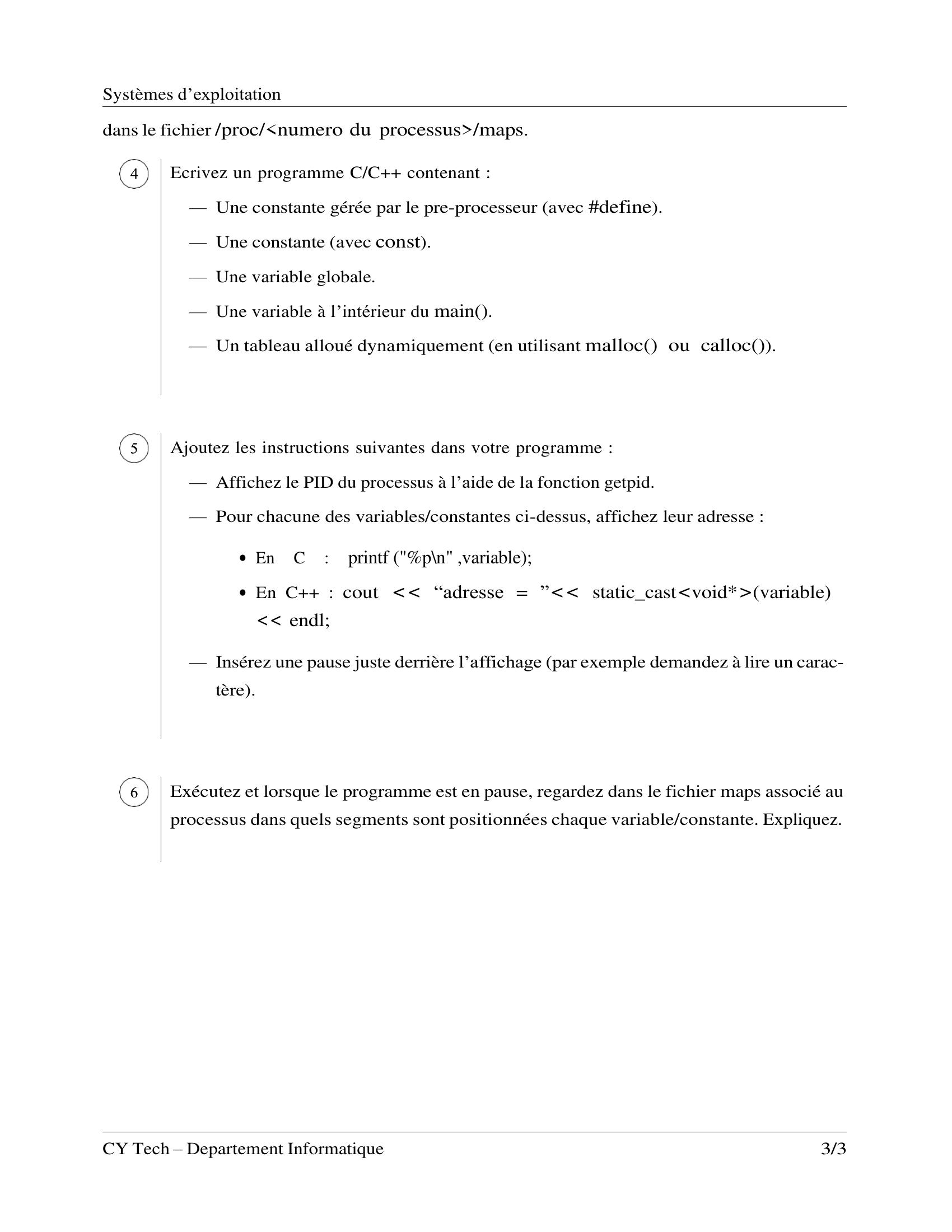 Page 3 : Systèmes d’exploitation CY Tech – Departement Informatique 3/3 dans le fichier /proc/numero du processus/maps. Ecrivez un programme C/C++ contenant : — Une constante gérée par le pre-processeur avec define. — Une constante avec const. — Une variable globale. — Une variable à l’intérieur du main. — Un tableau alloué dynamiquement en utilisant malloc ou calloc. Ajoutez les instructions suivantes dans votre programme : — Affichez le PID du processus à l’aide de la fonction getpid. — Pour chacune des variables/constantes ci-dessus, affichez leur adresse : • En C : printf "p\n" ,variable; • En C++ : cout “adresse = ” staticcastvoidvariable endl; — Insérez une pause juste derrière l’affichage par exemple demandez à lire un carac- tère. Exécutez et lorsque le programme est en pause, regardez dans le fichier maps associé au processus dans quels segments sont positionnées chaque variable/constante. Expliquez.